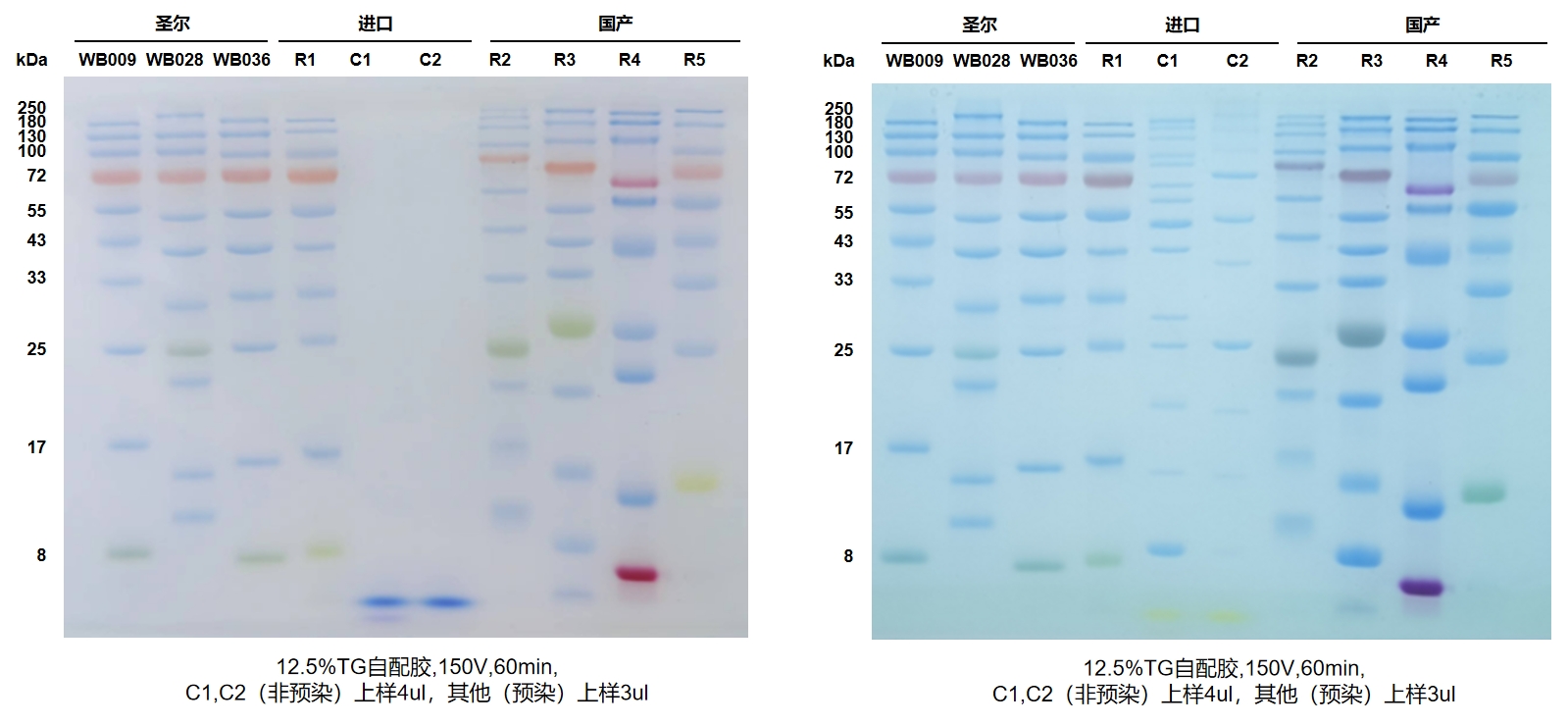 同时,圣尔还对各种手工胶、预混液和预制胶及缓冲体系进行测评,Share-bio预染蛋白marker条带质量表现最好;另经测评,在上层胶加染料对Share-bio预染蛋白marker基本无影响。(如需相关测评结果,可联系圣尔市场部获取)