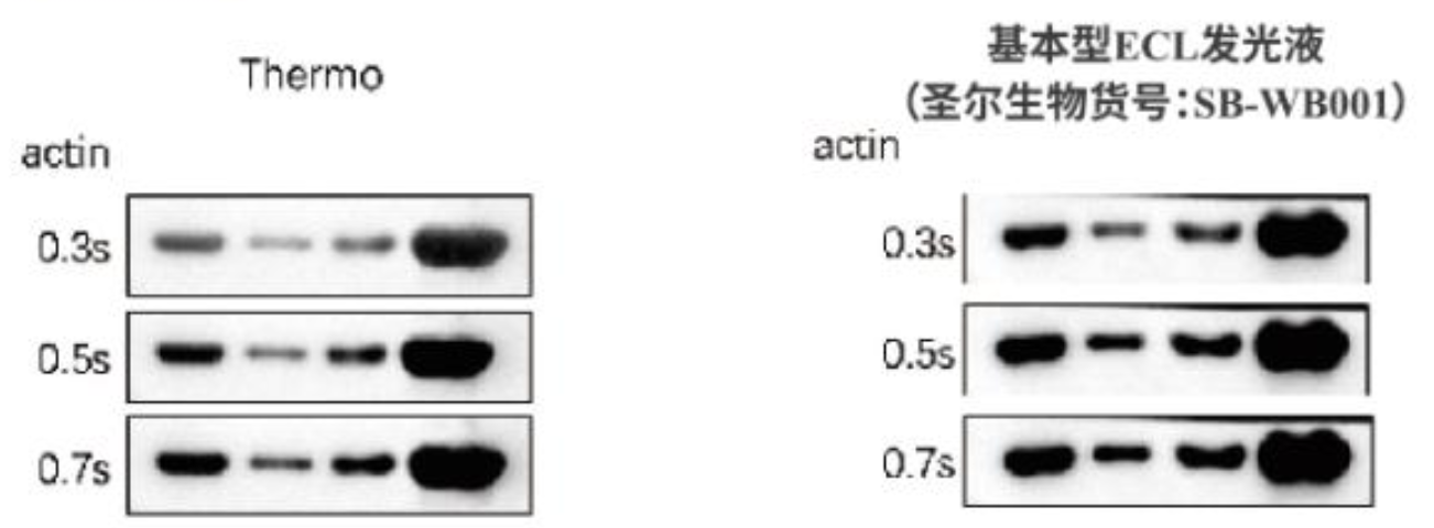 曝光时间:相同蛋白量下,圣尔所需曝光时间最短。