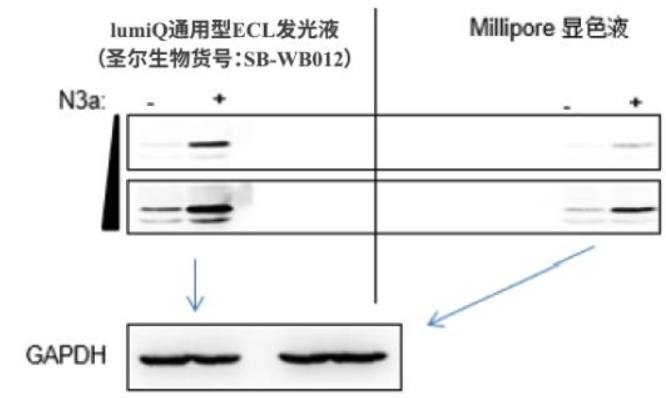 灵敏度:不同品牌ECL发光液显影效果差距明显。超低量(10ng总蛋白)检测中,圣尔发光液表现最为优秀。