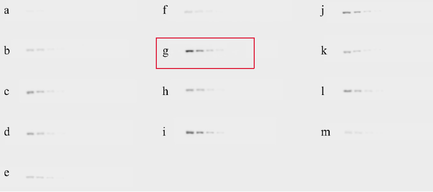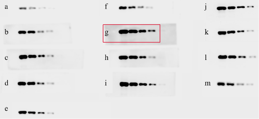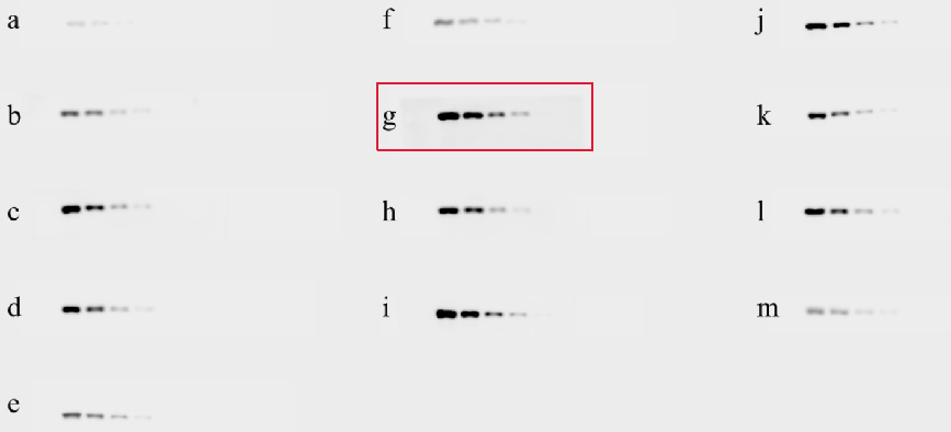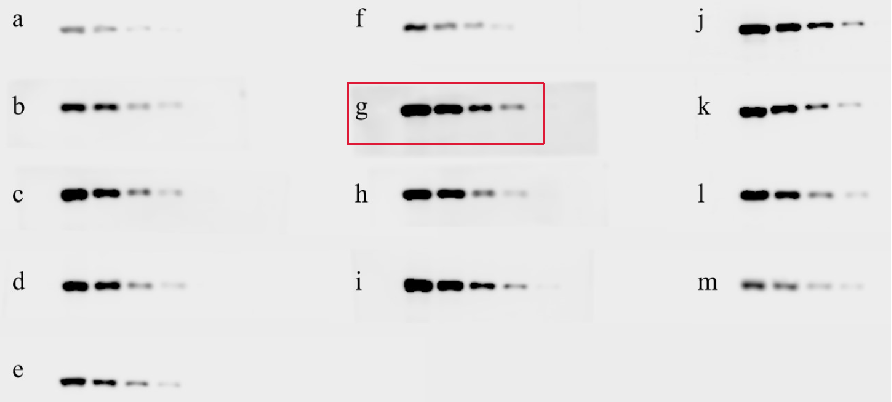 2. 显影灵敏度比较:系列蛋白量梯度,系列曝光时长,检测各品牌的蛋白浓度检测下限。实验浓度:500ng/孔,250ng/孔,100ng/孔,50ng/孔,10ng/孔。